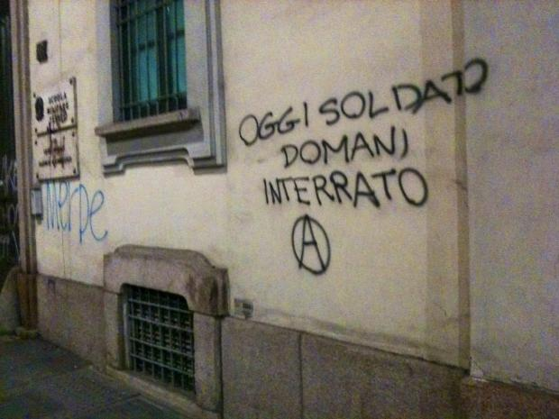 “Oggi soldato domani interrato”. Soltanto una delle scritte intimidatorie che da poco adornano la facciata di una delle tante anonime caserme italiane nelle quali si è fatta la storia della nazione. Vittima eccellente è la Scuola Militare Teulié di Milano, istituto di formazione dell’esercito a due passi dal Duomo e a tre dal Naviglio Grande.